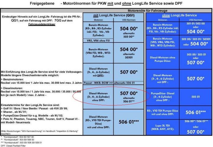 VW Freigaben Motoröl